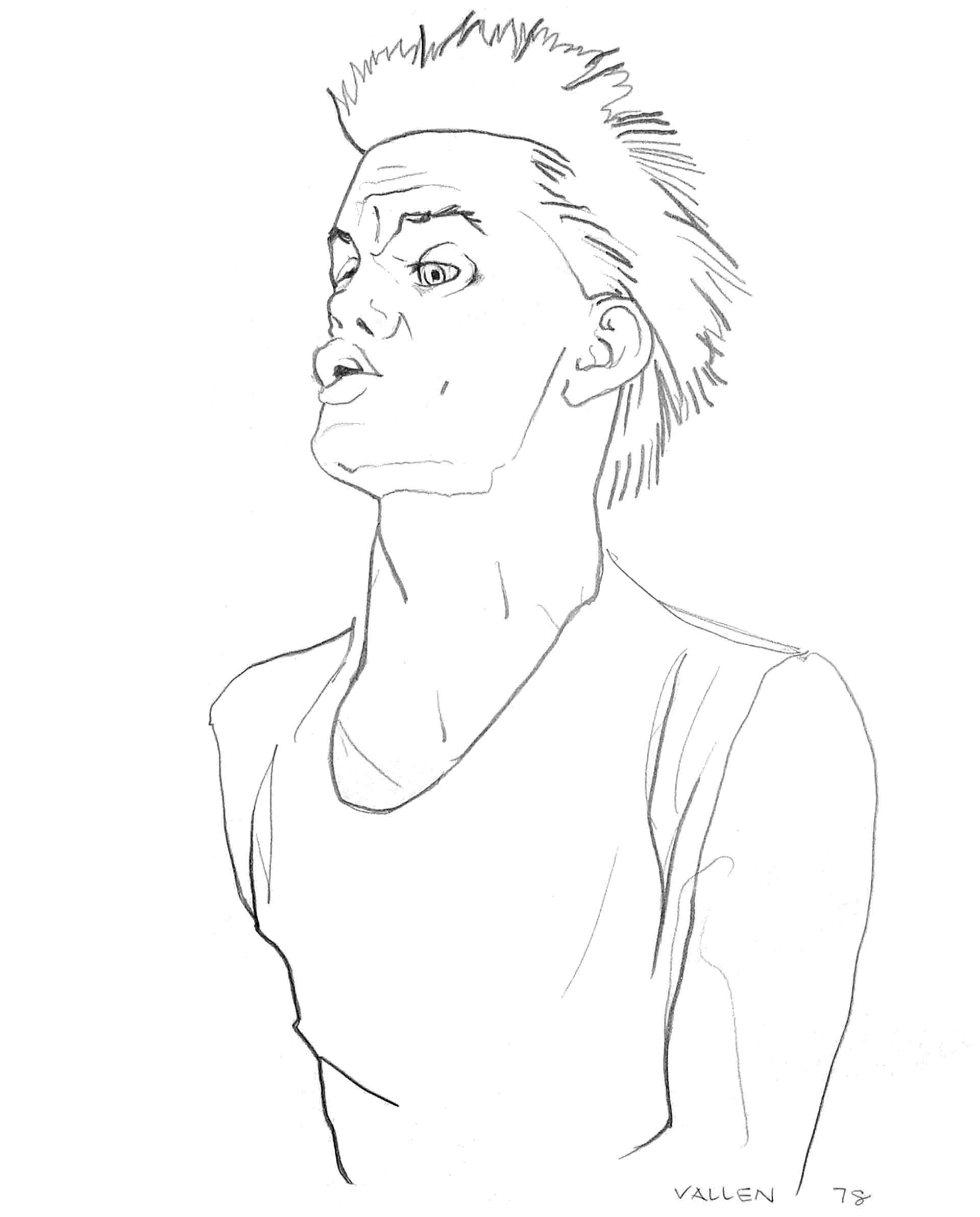Vallen made this live pencil sketch during one of the earliest Los Angeles performances by The Screamers. Vocalist Tomata du Plenty mesmerized audiences with farcical and deranged theatrics, while the band used synthesizers and computerized modules instead of guitars to produce distressingly weird music. The Screamers never released a record and disbanded in 1981. Tomata took up painting, pursuing it until his death in 2000. The Georgia Museum of Art located in Athens, Georgia exhibited Tomata’s paintings from Oct. 4, 2014 to Jan. 4, 2015 in an exhibit titled: Tomata du Plenty and the West Coast Punk Scene. Vallen’s “Tomata du Plenty” drawing was included in that show.